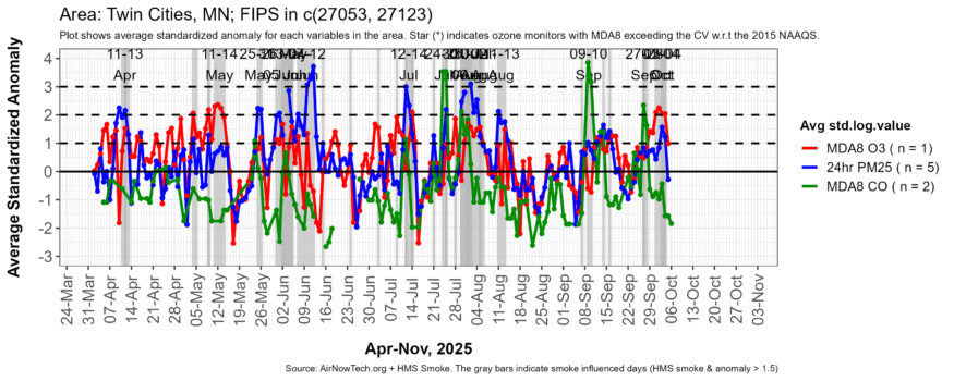 - Need to revisit the standardization; WI and LADCO note that the amplitude of ozone changes by month and should consider standardizing by monthly average instead of across the season; looking across multiple years may not make sense because of differences in the number of smoke days and impact of anthro sources; 2018 had the most # of smoke days in recent years in WI, similar to 2017 but different from previous years