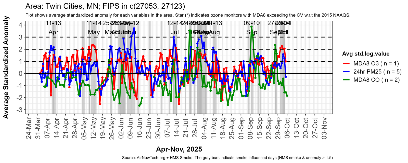 - Need to revisit the standardization; WI and LADCO note that the amplitude of ozone changes by month and should consider standardizing by monthly average instead of across the season; looking across multiple years may not make sense because of differences in the number of smoke days and impact of anthro sources; 2018 had the most # of smoke days in recent years in WI, similar to 2017 but different from previous years